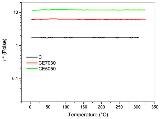Complex viscosity of the uncured epoxy-based blends: C (blue); CE7030 (red); CE5050 (green).