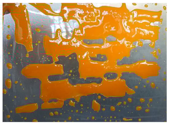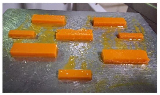 Once tested blend’s viscosity, printing trials to obtain specimens for thermomechanical testing were carried out. The first trials on the CE7030 blend resulted in unsuccessful printing (Figure 4). The printing failed completely as no shape was formed and only some cured layers deposited on the vat films were found. The same printing parameters used for the cream resin were applied in such trials (see Table 2). The short exposure times seemed not long enough to allow full curing of resin’s layers properly. This result is the effect of two parameters: the presence in the blends of the epoxy resin, which is designed for thermal curing only, that reduce the amount of photocurable moieties; the stoichiometric unbalance of the photointiator due to the epoxy resin addition in the blend formulation.