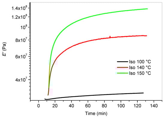 The results of the DSC tests showed the presence of an exothermic peak for the uncured cream resin outlining the presence of reactive moieties leading to the thermal curing of this system (see Figure 1). DMA is a suitable technique for the study of the thermal curing of solid systems after vitrification []. LCD photo-cured samples were analyzed by running isothermal DMA testing at three different temperatures (i.e., 100, 140 and 150 C). This test allowed to measure viscoelastic properties changes during the isothermal curing. Storage modulus (E’) versus time was monitored in detail. The cream resin tested at 100 C for 3 h showed only a slight variation of the storage modulus while, when the isothermal test was carried out at 140 or 150 C, the storage modulus increased of one order of magnitude within the testing time (Figure 6). The increase of the storage modulus is the result of the crosslinking reactions which starts, as demonstrated by the DSC tests (Figure 1), at 150 C.
