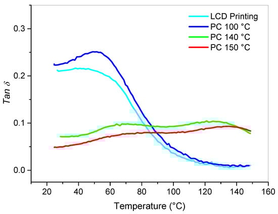 After being tested isothermally, the same samples were further analyzed by a ramp rate DMA test (Figure 7). The system cured at 140 C displayed two Tanδ peaks at 65 and 126 C. The resin cured at 150 C displayed one peak at 134 C and a shoulder at about 67 C. The specimen cured at 100 C showed a slight shift of the Tanδ peak from 45 C, measured for the LCD printed sample, to 50 C.
