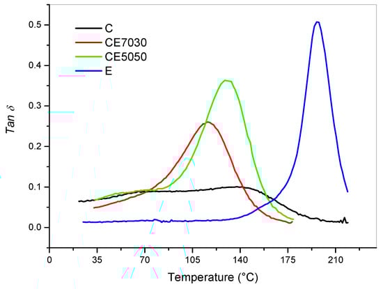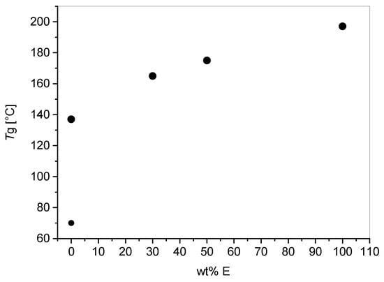 As with the viscosity, if we can consider commercial analogous systems (Table S1) it can be said that with dual curing, resin with higher were obtained. The cream unmodified resin (C) showed two glass transition temperatures () at 70 and 137 C while the pure epoxy formulation (E) a of 197 C. Epoxy blending resulted in one single broad Tanδ peak reaching, for the 50:50 blend, with a value of 174 C. The blends obtained mixing the two formulations showed an increasing with higher epoxy content (Figure 9). The vs epoxy content graph shows a quasi linear correlation considering only the high for the cream resin. This trend is typically observed for blends forming the so-called interpenetrated network [].