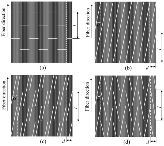 In order to further improve mechanical properties of SFRP, researchers tried to develop a SFRP with unidirectional fiber distribution. Taketa proposed a new type of short fiber reinforced polymer composites UACS (Unidirectionally Arrayed Chopped Strands), as shown in Figure 1a, which was achieved by introducing series of regular slits in the traditional CFRP prepreg [7]. UACS exhibits better strength than former SFRP, while maintaining excellent fiber flowability, hence making it suitable for manufacturing load bearing structures with complicated geometries. As the direction of initial slits is perpendicular to the fiber direction, the interlaminar shear strength of CFRP laminate is much lower than the tensile strength in the fiber direction; it is easy to cause failure in slits at low load and lead to a large area of delamination damage. Therefore, the full utilization of high strength properties of carbon fiber is not satisfactory for this kind of UACS. After that, Taketa et al. improved the design scheme of the initial UACS and proposed the continuous slit with a small angle (Figure 1b) [8,9]. The proposed angled continuous slit reduced the normal stress at the slit compared to the initial UACS laminate under the same tensile load, thus improving the strength of the UACS laminate. However, since all the continuous slits are throughout the prepreg, once the delamination damage occurs somewhere in the slit, it will propagate along the slit direction and result in the final failure.