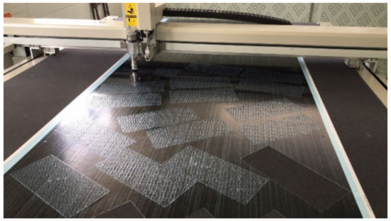 In this research, the commercial continuous CFRP prepreg of UIN12500 (T800) (Guangwei, Weihai, China) was selected as the material, with the thickness of 0.125 mm and the fiber volume fraction of 60%. The longitudinal modulus, strength, and Poisson’s ratio of the prepreg are 139 GPa, 2900 MPa, 0.3, respectively. Bi-angled slits on the UACS prepreg, as well as prepregs for all the plies with different angles, were made by a commercial numerical control cutter (Jingwei, Ningbo, China) as shown in Figure 2. The schematic and dimension of bi-angled slits is shown in Figure 3a. The angle (α) between the slit and fiber direction, as well as the width of the slit (d), are set as 11.3° and 5 mm, based on the reported research [10,11]. It is easily imagined that the bi-angled slit keeps the orthotropic symmetry of received prepregs and is convenient for design and fabrication.