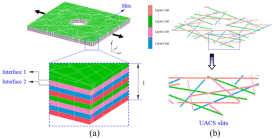 Model for the notched UACS laminate: (a) the overall structure of the model, (b) detail distribution of slits.