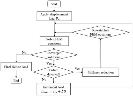 where, Xt, Yt, and Zt are tensile strengths of the CFRP in three principal axes, while S12, S23, and S31 mean shear strengths in three principal planes of the present material. The detail values of the parameters are listed in Table 1. The displacement load was added at the left edge of the model in the fiber direction of 0o ply, as shown in Figure 6. Figure 7 shows the flowchart of the present damage analysis, adapted from the previous work [11]. It is assumed that all the elements reveal the linear elastic deformation before damage, and the damage diagnosis is conducted at each load step. As for the cohesive element, the damage is following the bilinear property, taking the parameter d of 1 as the critical failure criterion. Considering the brittleness of CFRP, once the CFRP failures, the stiffness of the CFRP element decreases to 1% of its initial value. As for slits, linear elastic deformation process is defined before yielding failure in analysis, since the epoxy is isotropic material.