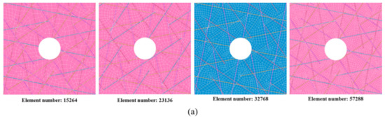 Obtained numerical and experimental results are listed in Figure 8, Figure 9, Figure 10, Figure 11, Figure 12, Figure 13, Figure 14 and Table 3. Figure 8 shows the effect of the mesh number on simulation accuracy. FEM models with four kinds of mesh number are given in Figure 8a, and it can be easily imaged that the mesh become denser with the increasing of mesh number. From Figure 8b, it could be found that the strength converges to a stable level when the mesh number is over about 30,000. It is inferred that the mesh number of about 32,000 is suitable for the present simulation based on these results, which can ensure good accuracy and reduce a certain computational cost. Therefore, all the models used in the present study were constructed with the mesh number of about 32,000. Furthermore, models with similar structure and mesh number of unnotched UACS laminate were constructed for comparative study.
