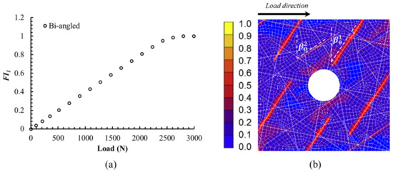 Failure loads for different stages of crack propagation of notched and unnotched UACS laminates with bi-angled slits are given in Table 3. The first failure is found in the slits of 0° plies near the hole at relatively low load of about 2.8 kN for the notched laminate, which is about 35% of the final failure load. After that, failures are found in the matrix of 90° plies and ±45° plies at loads of 3.7 kN and 5.1 kN, respectively. Then, the delamination occurs between the 0° ply and ±45° plies at the load of 7.7 kN, which is quite close to the final failure load of 7.9 kN, because there are a few fiber breakages in the case of notched UACS laminate with bi-angled slits. It could be found that the maximum load of notched UACS laminate is about 60% of that of the unnotched one. Furthermore, the load level at different stages of the damage propagation process for the notched UACS laminate is lower than that for the unnotched one, and it is considered to be caused by the stress concentration around the open hole. Figure 9a shows the progressive failure curve of index FI1 of slits in the 0° ply with the increase of load. It is clear that the failure index FI1 increases linearly before final failure, and it could be considered as the elastic deformation before yielding. Figure 9b gives the damage image of slits in the 0° ply at 2.8 kN. It could be clearly seen that the initial damage occurs mainly along slits with the inclination angle of = 33.7° instead of = 56.3° due to the larger normal stress at slits of .