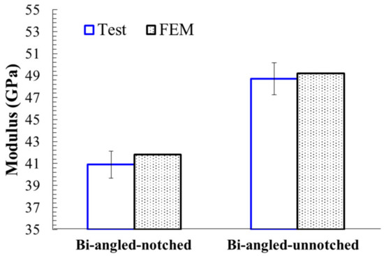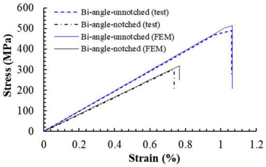 Typical stress-strain curves for notched and unnotched UACS laminates with bi-angled slits obtained from numerical simulation and experiments are depicted in Figure 11. It can be seen that, for the unnotched UACS laminate, both experiment and simulation captured the nonlinear behavior before the final failure, which is considered to be the nonlinear progressive damage in matrix and delamination. The simulation results overall match well with the experimental result, although there is a little overestimate on strength for the simulation by about 5% compared to the experiment. As for the notched UACS laminate, the tensile strength decreased dramatically to about 60% of the strength of unnotched UACS laminate. A similar overestimate on strength (7%) for the simulation was observed. It is clear that the present simulation method shows better accuracy in simulating the unnotched UACS laminate compared to the notched laminate, both for strength and strain. It is actually reasonable because it is inevitable that there will be minor damage at the free edge during cutting, especially damage around the open hole during the process of drilling; therefore, it is difficult to prepare perfect notched and unnotched specimens in an experiment, like the FEM models in simulation. In addition, no nonlinear behavior is observed in the stress-strain curves of notched UACS laminates, both those obtained from experiments and simulation. It means that, for the notched UACS laminate, the damage propagated very quickly before final failure compared to unnotched ones, due to the significant stress concentration near the open hole, while Figure 12 gives the modulus of the notched and unnotched UACS laminates with bi-angled slits obtained from numerical simulation and experiments. The modulus of the notched UACS laminate is 40.9 GPa, which is about 84% of the unnotched one. Obviously, the present analysis model shows excellent accuracy in simulating modulus with the error less than 3%.