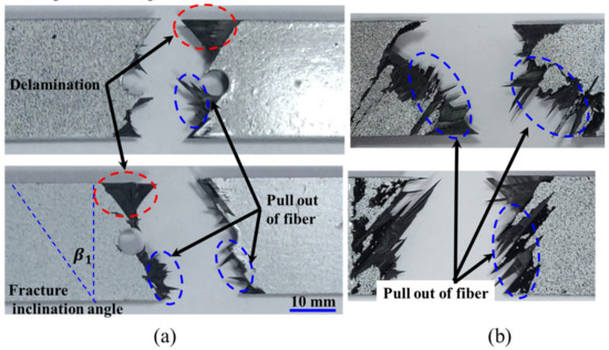 Figure 13 shows typical images of fractured specimens of notched and unnotched UACS laminates with bi-angled slits. As for the notched UACS laminate, a large region of delamination could be found from the fracture surface as marked by the red ellipse dashed lines, and there is relatively less fiber pulling out phenomenon as depicted by the blue ellipse dashed lines, which clearly differs from the fracture pattern of the unnotched UACS laminate with bi-angled slits as shown in Figure 13b. It is understood that the final critical failure mode for the notched UACS laminate is mainly dominated by the delamination instead of the fiber breakage in unnotched UACS laminates. This experimental observation shows good agreement with simulation results described in Table 3. In addition, the average fracture inclination angle of notched UACS specimens is measured as about 35.2°, which is quite close to the difference between the ply angle (45°) and inclination angle of slits (11.3°). Therefore, it is inferred that the notched UACS laminate mainly fractures along the slits in ±45° after the initial failure in slits and the consequent delamination, as shown in Figure 9b and Figure 10b.