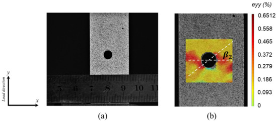 The DIC technology is used to investigate the strain field around the open hole of the notched specimen, and the typical image is given in Figure 14. Figure 14a shows the specimen surface with random speckle pattern, which is used to track the deformation of the specimen surface, while the typical strain field in load direction of the present notched UACS laminate at 90% of the final failure load (7.1 kN) is presented in Figure 14b. It is observed that the high strain concentration in load direction occurred around the open hole, especially along the inclination angle , which is measured in the range from 32° to 38°. It shows good agreement with the observation in Figure 9 and Figure 13. Under this load, failure has already existed in the matrix of all the plies; however, the delamination does not yet occur, according to Table 3.