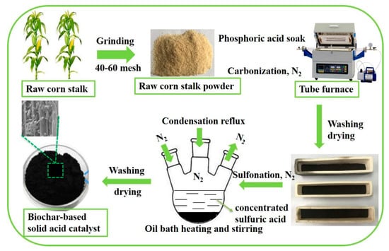 Solid acids catalysts are a class of catalysts that loads acids ions onto a solid and provides protons or accepts electrons in a reaction. They can be roughly divided into the following categories: immobilized liquid acids, oxides and metal salts, natural clay minerals, zeolites, heteropolyacids, cationic exchange resins, solid super acids, carbon-based solid acids [8]. Among them, carbon-based solid acids are considered to have potential application value with many advantages of easy preparation, high selectivity, high activity, easy separation and easy recycling [9]. Renewable biomass resources are a better choice for synthesizing carbon-based solid acids via carbonization and sulfonation. In recent years, renewable biomass resources have gained great attention for their ability to synthesize carbon-based solid acid due to their abundance, renewability, biodegradability, biocompatibility and versatility compared to traditional materials for preparing solid acids [10]. Therein, corn stalk is one of the renewable and abundant biomass resources in China, and it contains a considerable amount of carbohydrates, which can potentially be used to produce multifunctional materials. Corn stalk has a strong spongy soft structure, which can be used for immobilizing more functional groups on the surface or inside. Traditional corn stalk-based solid acid catalysts are synthesized from unactivated raw materials, low carbonization temperature or short-time sulfonation, which results in a small specific surface area and a low loaded acid amount [11].