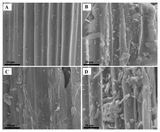 Figure 2 shows the surface morphology of raw corn stalk, SAC-1, SAC-2 and SAC-3. It can be found that the catalyst showed rod-like features inherited from raw corn stalk. These structures remained after the carbonization and sulfonation processes in all samples. In comparison to the raw corn stalk (Figure 2A), the prepared catalysts had a relatively rough surface and a distinctly looser structure with more small broken pieces. It may be attributed to the destructive effect of carbonization and sulfonation; the destroyed components aggregated to form irregular small broken pieces and attached onto the surface of the catalysts, and further formed gaps and holes [13]. More small broken pieces were produced with the increasing carbonization temperature, and it indicates that the structure of the solid acid catalyst was gradually destroyed.