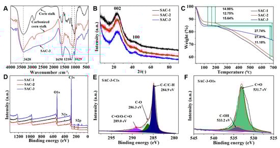 The FT-IR spectra of raw corn stalk, carbonized corn stalk and SAC-3 are shown in Figure 3A. Compared to the raw corn stalk, carbonized corn stalk produced at 800 °C contained both aromatic and aliphatic hydrocarbons, which was indicated by the peaks at approximately 2899 (aliphatic C–H stretching) and 894 cm−1 (aromatic C–H bending). After sulfonation of the carbonized corn stalk, the most obvious changes are the stretching vibration bands of SAC-3 at around 1210 and 1029 cm−1 assigning to the O=S=O stretching of –SO3H, which indicates the successful load of the –SO3H group on the biochar-based solid acid catalyst [13]. In addition, the stretching vibration band at 1650 cm−1 is indicative of the vibration of C=O in the –COOH group [19]. Moreover, the peak at 3428 cm−1 was ascribed to the C–OH bending and –OH bending in the –COOH group. This suggests that incomplete carbonization reactions occurred in the carbonization process, resulting in structural changes of the carbon precursor.
