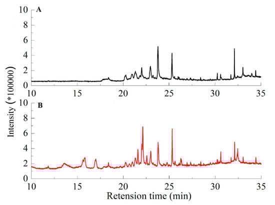 GC-MS chromatogram of products generated from hydrothermal degradation of lignin without (A) and with (B) solid acid catalyst of SAC-3 under the conditions of 290 °C, 8.2 psi for 30 min.