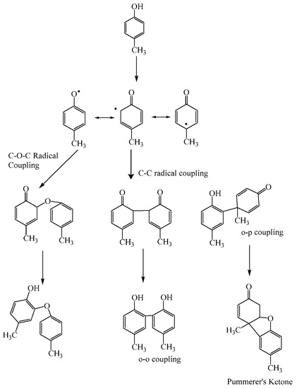In typical enzymatic reactions, free radicals initially formed from the monomer undergo coupling to produce dimers, trimers and higher oligomers. This process of successive oxidation and coupling of oligomers can lead to the formation of high molecular weight polymers. Sahoo [32] and co-workers used in situ nuclear magnetic resonance (NMR) to probe the nature of coupling reactions that occur in the very early stages of peroxidase catalyzed polymerization. Detailed NMR investigations showed that two kinds of couplings are possible during polymerization of a simple phenol such as p-cresol—(a) C−C coupling to form phenylene units and (b) C−O−C coupling to form oxyphenylene units (Figure 4). The authors [33] also report the formation of Pummerer’s ketone as a major side product. The absence of enolic structure in this ketone prevents propagation of polymerization reaction. While the ketone can be removed from the reaction mixture by multiple wash steps, polymer yields are reduced because of ketone formation. The formation of Pummerer’s type ketone must be avoided/suppressed to enable enhanced polymer yield. This is discussed in detail in Section 4.4.