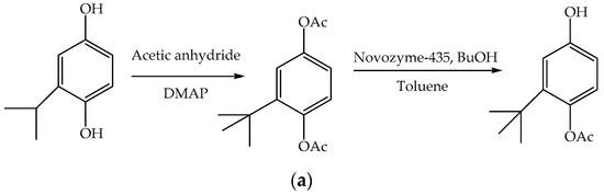 In the first step, phenolic hydroxyl groups in t-BHQ were first protected by acetylation (Figure 6a,b). Lipase catalyzed reaction of the diacetylated compound in toluene at 37 °C resulted in selective removal of one of the acetyl groups, resulting in the formation of 4-acetoxy-3-tert-butylphenol.