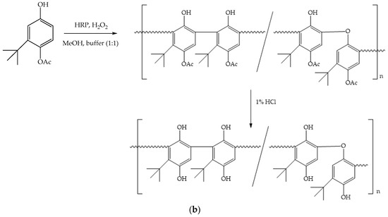 Polymerization of a wide range of substituted phenols has been attempted. The structures of these monomers are summarized in Figure 5. Dhawan et al. [83] polymerized substituted phenols using hydrogen peroxide as the oxidant and peroxidases as catalysts. Among the hindered phenol compounds used as AO, 2-tert-butylhydroquinone (t-BHQ) is an indispensable AO in the food industry. Polymerization of t-BHQ was initially attempted using HRP as a catalyst. However, formation of 2-tert-butyl-1,4-benzoquinone as a side product prompted the design of a chemo-enzymatic route for synthesis of polymer.