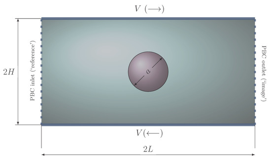 The inlet and outlet walls have Periodic Boundary Conditions (PBCs), the implementation of which is detailed in Section 2.2.3. At the top and bottom panels, the “no-slip” boundary condition is considered.