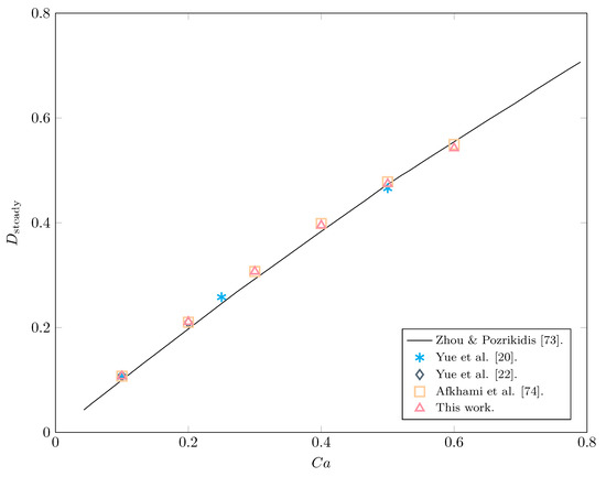 Comparison of the steady-state deformation of a Newtonian drop in a Newtonian matrix between our results and those found in Zhou & Pozrikidis [73], Yue et al. [20,22], and Afkhami et al. [74].