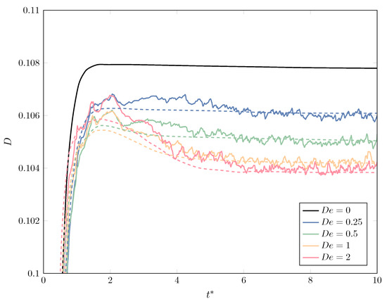 Despite the rather coarse mesh used (equivalent to a uniform size ), the not-so high number of dumbbells and the totally different approach taken by the two techniques compared—the diffuse-interface method combined with a phase-field approach ruled by Cahn–Hilliard dynamics to study the Newtonian/non-Newtonian problem in a unified way of [21] and our FEM-based, stochastic method—the results presented in Figure 5 are in remarkably good agreement, especially the steady-state values of the deformation parameter D. However, also the transient behavior shows a noteworthy resemblance, with the overshoot appearing for sufficiently high values and the evolution of being for higher than those for . In any case, we notice the effect of the drop viscoelasticity as a means to reduce the deformation of the interface; plots of the actual shape of the interface (not included here for brevity’s sake) show this same trend. Apart from the stochastic noise, the modification of the interface by the correction step of the marker particles and the mass conservation step add to the oscillatory behavior of D observed in Figure 5, which is explicitly computed from the discrete interface. Moreover, Figure 5 underscores the elastic effects of the drop, since an increase in the Deborah number produces a larger ratio between the maximum and the steady-state value of the deformation parameter D, as a consequence of the longer time (slower response) that the polymer molecules take to recover from the applied shear strain.