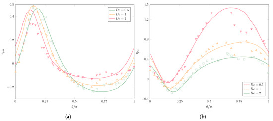 Figure 6b shows the tangential component of the polymer stress tensor , with the unit vector tangent at all points to the interface and perpendicular to (so that, in 2D, ). Here, the polymer stresses are much larger than for the normal component, showing again an excellent agreement between our results and those in [22]. The larger values intensify the tangential stresses at the equator, being responsible to a larger extent for the reduced deformation observed for the higher . Despite small discrepancies, even with a coarse mesh and computationally inexpensive simulation, our results compare very well with those of the reference, capturing the minimum and maximum values of , as well as the evolution of along the interface.