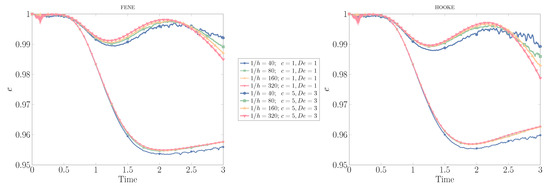 In Figure 7, we present the results for convergence under mesh refinement, for the FENE and Hooke models: for the case with weaker viscoelastic effects (), the number of ensembles is , while the number of dumbbells inside each ensemble is for both stochastic models. When the polymer concentration is increased (), we scatter more ensembles in the ambient (polymeric) fluid to capture the more dramatic effects in shape deformation, reducing the number of dumbbells within each ensemble to to keep the computational demands at a similar level. The results obtained here compare very well with those provided in [7] for purely uncorrelated dumbbells, showing excellent convergence with mesh refinement for both kinetic models and degrees of polymer concentration. Only in the coarser mesh, , do we observe a slightly different behavior to that produced by the other unstructured meshes. This pattern is more evident when using the Hooke instead of the FENE dumbbell model, due to the larger stresses produced by the former model during drop deformation: the minimum value of the circularity decreases for both and , and we observe a lower local maximum at for , with the drop showing a lack of deformation at the latter stages of the simulation ().