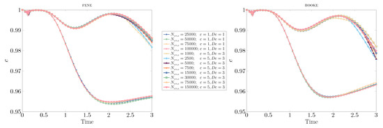 Figure 8 shows the evolution of the circularity when the number of ensembles and dumbbells per ensemble changes, keeping the product constant so as to maintain the computational cost; the mesh size is . For the case with lower polymer concentration and viscoelastic effects, the convergence results are remarkable for both models. When the concentration parameter and Deborah number are increased to , we observe a small discrepancy in the circularity values, proving that a certain number of ensembles are required to reconstruct, in an accurate way, the stronger polymer stresses. However, there seems to be an optimal value of and for a given computational cost, with this value of being larger for Hooke than for the FENE model. In any case, such a modest diverging behavior is only observed at or after the minimum circularity () or local maximum circularity () are attained.