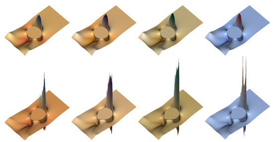 As we did with Equation (1), the convective terms in Equation (4) are dealt with using a semi-Lagrangian approach, as proposed first in [53]. The level set function is initialized as a signed-distance function to improve the regularity and behavior of the transported solution. However, as time goes on, discretization errors build up in the form of numerical artifacts that may eventually propagate into the interface and destroy it. To prevent this undesired effect, an Eikonal-based, redistancing procedure [54] is performed at each time step, so that we ensure that, within a band around the interface, the level set function preserves the signed-distance property. To improve mass conservation and shape definition, we add marker particles [18] that are passively advected by the flow, helping to correct the interface by defining local level set functions with a variable radius , accounting for lost resolution in the sub-grid scales (see [37] for details).