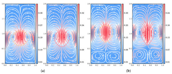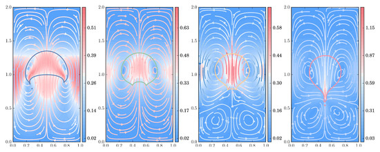 Finally, we explore the flow pattern, streamlines, and isocontours of the polymer stress tensor, in a series of simulations under increasing polymer concentration and relaxation times, using the FENE dumbbell model with extensibility parameter ; see Figure 13, Figure 14, Figure 15 and Figure 16. For all the subsequent numerical experiments, a uniform, unstructured mesh of size is used, with the number of dumbbells per ensemble and the number of ensembles being collected in Table 1. Notice that, for stronger viscoelastic effects, a larger number of ensembles are scattered throughout the domain, reducing the computationally available number of dumbbells per ensemble, which in turn translates into a larger stochastic noise. Two different density and viscosity ratios are explored to underscore the effects caused by the polymer solution on the shape deformation and flow pattern of the drop () and of the bubble ().