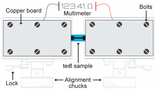 To measure resistance of the PDMS-PEDOT/TOS device while under strain, a custom stretch system was assembled (Figure 1). This system consisted of two moveable alignment chucks secured side by side on a large base plate. The PDMS-PEDOT/TOS was positioned so that one contact was on one chuck and the other contact resided on the other chuck, with the middle (or tract section) freestanding between the two chucks. Copper boards were then placed on top of the PDMS-PEDOT/TOS contacts and tightly bolted down. The board served two purposes: (i) to provide an electrical connection; and (ii) to mechanically anchor the contacts onto the chucks. To stretch the sample, one chuck was locked into a fixed position and the other was slowly moved further away using an in-built positioning wheel. The stage was moved 0.25 mm each time and a two-electrode resistance measurement was carried out at each strain interval. The resistance measurement was taken for 10 s and the average value was calculated from this trace.