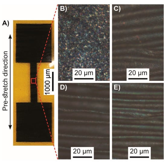 (A) Final device design with two contact pads joined by a 500 µm wide by 2000 µm long track. The device shown illustrates a laser structured PEDOT/TOS film on PDMS which was pre-stretched by 80%. The device is clear, however, here it was imaged on a Kapton substrate, giving it a yellow color. The close-up images show the structure of PEDOT/TOS on PDMS which had: (B) 0% pre-stretch; (C) 40% pre-stretch; (D) 60% pre-stretch; and (E) 80% pre-stretch. Clear buckled structures can be seen in PEDOT/TOS films which were placed onto pre-stretched PDMS that was then allowed to relax.