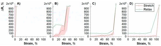 Strain vs. change in resistance profile of PDMS-PEDOT/TOS system under: (A) 0% pre-stretch; (B) 40% pre-stretch; (C) 60% pre-stretch; and (D) 80% pre-stretch. The graphs show both the stretching (red) and relaxing (green) cycles and the shaded areas indicate standard deviation (n = 3, plotted as the average ± SD).