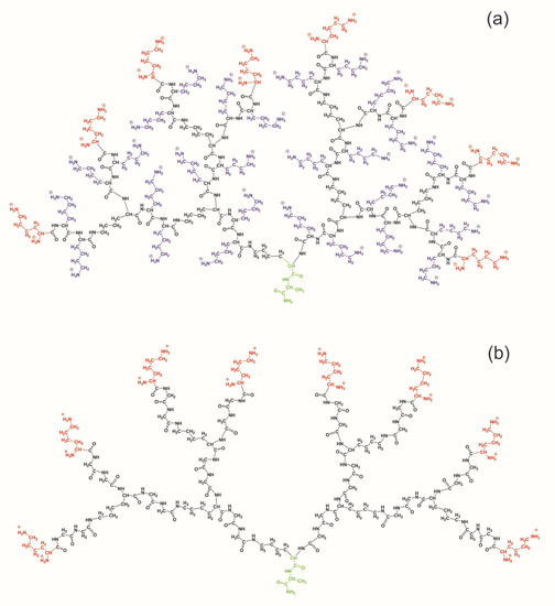 Two peptide dendrimers of the second generation with the same backbone but with different repeating units: Lys-2Gly or Lys-2Lys, were studied by computer simulation. The full atomic model, molecular dynamics method, and Gromacs package [67] were used. The structure of both dendrimers is shown in Figure 1. Both dendrimers have a core (marked by green color in Figure 1), a backbone (black), and terminal groups (red). The difference between two dendrimers is the bulky charged side groups of inserted 2Lys spacers (marked by violet) in Lys-2Lys dendrimer. Simulations were performed for each dendrimer in water with the explicit Cl-counterions. The number of those counterions (see Table 1) was equal to the number of charged groups in the dendrimer.
