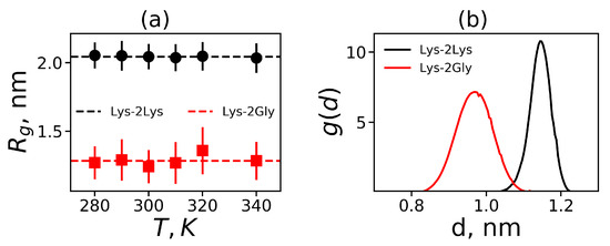 To study the temperature dependences of dendrimer size for both dendrimers we plotted in Figure 5a the gyration radius for Lys-2Lys and Lys-2Gly dendrimers as a function of temperature. According to Figure 5a, the gyration radius does not change with temperature for both dendrimers. The average values of for these dendrimers are depicted by dashed lines in Figure 5a. The size of Lys-2Lys ( nm) is approximately 1.5 times larger than the size of Lys-2Gly ( nm). The size of Lys-2Gly is also close to the size of the usual (without insertion of 2Lys or 2Gly spacers) Lys-dendrimer ( nm) simulated in the recent paper [31].