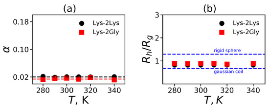 The value of is between 0 (for a sphere) and 1 (an extremely elongated ellipsoid). Simulation of different dendrimers shows [95,98,99] that the dendrimers of small generations have an ellipsoidal shape, but their shape becomes more and more spherical with increasing generation number. Figure 6a shows the average value of as a function of the temperature T for Lys-2Lys and Lys-2Gly dendrimers. It is easy to see that is almost constant and very similar for both dendrimers. The small values of (~0.02) indicate that these dendrimers have almost spherical shapes. Interestingly, the lysine dendrimer of the same generation without insertion of 2Lys or 2Gly spacers at room temperature [31] has ~, i.e., it is an order of magnitude larger than the values obtained in this study for Lys-2Lys and Lys-2Gly dendrimers.