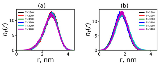 In each terminal lysine, marked by red color in Figure 1, there are two charged NH+ terminal groups. The radial distributions of the number of these nitrogens in all terminal groups for Lys-2Lys and Lys-2Gly dendrimers at different temperatures are shown in Figure 8. This function for both dendrimers is practically independent of temperature. The radial distribution for Lys-2Lys (see Figure 8a) has an asymmetric shape and is shifted to the right (to larger distances r from the center of mass of the dendrimer) compared to the distribution for Lys-2Gly that has (see Figure 8b) an almost symmetrical shape. The shape of for Lys-2Gly is close to the shape for the usual lysine dendrimer at room temperature [31]. The positions of maxima correspond to the distances between the core and the terminal groups in these dendrimers (see Table 3).