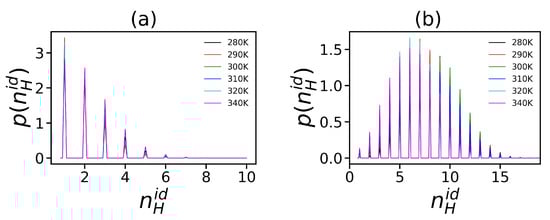 Hydrogen bonds exist between the donor and acceptor groups [103,104,105,106]. The presence of hydrogen bonds is determined by simulation using the coordinates of donor and acceptor according to two rules: the maximum distance between the donor and the acceptor should be less than 0.35 nm, and the angle between the donor and acceptor bonds should be less than 30° [106]. The average distribution of the number of intra-dendrimer hydrogen bonds is depicted in Figure 9.