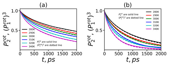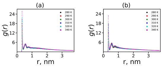 The productive run was performed by the molecular dynamics method with an integration step of 1 fs. Simulation was performed in the NPT ensemble. Constant temperatures of 280, 290, 300, 310, 320, and 340 K were maintained by the Nose–Hoover thermostat [88] with the time constant = 0.4 ps. A constant pressure of 1 bar was maintained by the Parrinello–Rahman barostat [89] with = 0.5 ps and with compressibility of water 4.9 × 10, 4.7 × 10, 4.5 × 10, 4.4 × 10, 4.4 × 10, 4.4 × 10, and 4.4 × 10 bar at temperature 280, 290, 300, 310, 320, and 340 K, respectively [90]. Each system was simulated for 250 ns and the all atomic coordinates were recorded after each 100 fs.