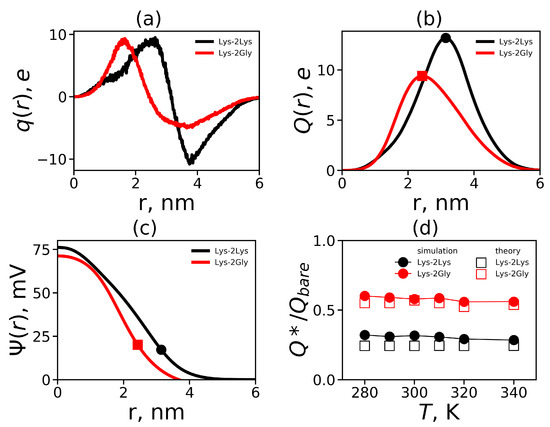 where the coefficient (for a diluted solution). As mentioned above, the Lys-2Lys and Lys-2Gly have spherical shapes (see Figure 6a) and can be considered as charged spheres with a radius of (the position of the maximum of the cumulative charge distribution ) and a bare charge of (see Table 1). Then, the radius , where is the average size of a simulation cell (see Table 1).