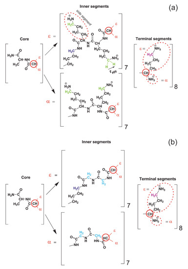 In this section, we describe the results of the calculations of orientational mobility of different vectors inside each dendrimer including core-to-end vectors (averaged over all paths from the center of the dendrimer to its ends) and HH vectors in different CH groups. Two main types of CH groups were considered: (1) the CH groups connected with NH groups are in the backbone and named as “inner” CH groups; (2) the CH groups are connected with NH groups are in the terminal segments and named as “terminal” CH groups. In Lys-2Lys there are also additional CH groups connected with NH groups in side segments of 2Lys spacers (marked in green in Figure 12a), and we named them as “side” CH groups. In Lys-2Gly there are two CH groups in the main chain of each inserted 2Gly spacer (marked by light blue in Figure 12b), and we named them as “inner-Gly” CH groups.