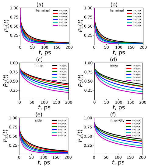 To obtain characteristics of NMR relaxation of CH groups in our dendrimers we have computed the second-order autocorrelation function (see Equation (16)) for vector in different CH groups. We obtained that the decay of this function for both dendrimers is similar for terminal groups (see Figure 14a,b) as well as for inner groups (see Figure 14c,d). At the same time, the ACF or terminal CH groups decays significantly faster than that of the inner CH groups for both dendrimers (see Figure 14a,c vs. Figure 14b,d). This result is in agreement with the prediction of theory for dendrimer molecules [113]. Moreover, we calculated the orientational ACF for side CH groups of the Lys-2Lys dendrimer (see Figure 14e) and for inner-Gly CH groups of the Lys-2Gly dendrimer (see Figure 14f). The behavior of the function for the side CH groups is very similar to the behavior of the terminal groups of Lys-2Lys (Figure 14a,e). In contrast, the relaxation of the inner-Gly CH groups (see Figure 14f) is similar to relaxation of the inner CH groups (see Figure 14b) of the Lys-2Gly dendrimer.