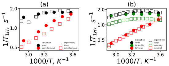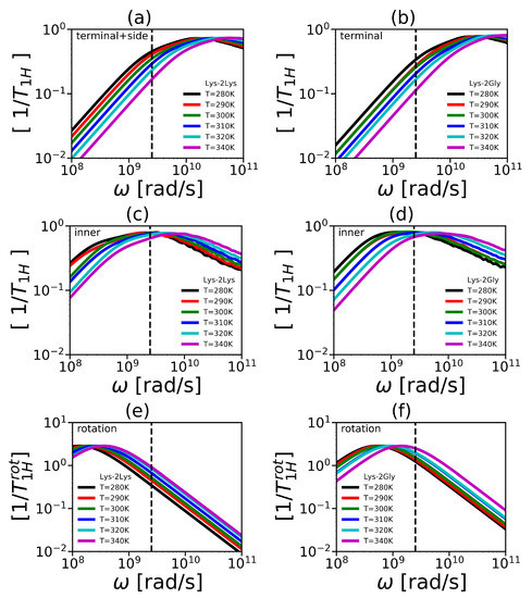 The reduced spin-lattice relaxation rate is shown in Figure 15. We combined the side and terminal groups in Lys-2Lys into one group—“terminal+side” (see Figure 15a) as a similar procedure was used in NMR [63]. Furthermore, there was not a significant difference between them in our simulation. The frequency dependencies of for the terminal group for Lys-2Gly (see Figure 15b) and inner groups of both dendrimers (see Figure 15c,d) are presented in Figure 15.
