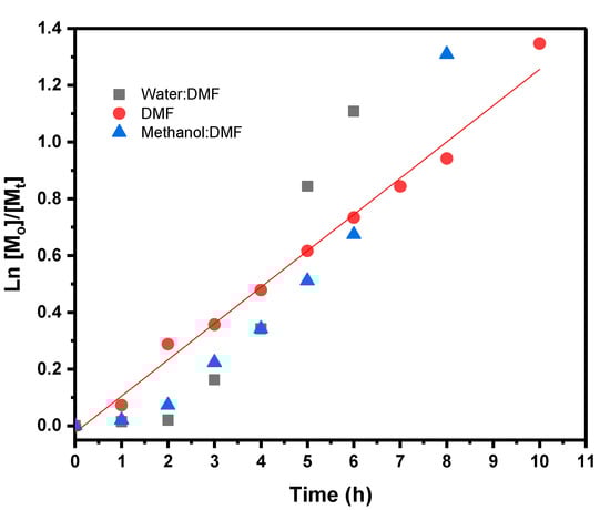 Kinetic plot of poly(2-acrylamido-2-methyl-1-propanesulfonic acid) (PAMPS) synthesized by [Ru(o-C6H4-2-py)(phen)(MeCN)2]PF6 in different solvents.
