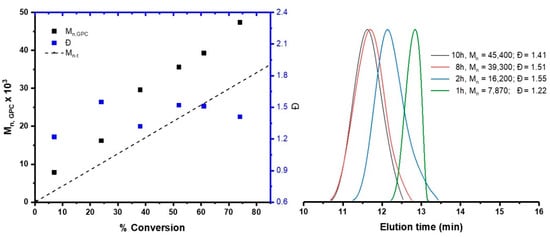 As can be seen in Figure 3, the Mn increased with conversion and a narrow molecular weight distribution is obtained (in the range of 1.22–1.55). A discrepancy was observed between the theoretical (Mn-t) and experimental Mn values due to the difference in the hydrodynamic volume between PAMPS, which is hydrophilic, and the hydrophobic calibration standard (PMMA) [,,].