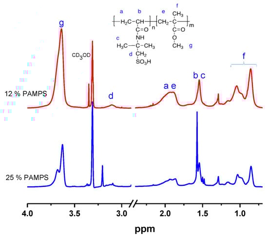 1H-NMR (CD3OD) of poly(2-acryloamido-2-methylpropanesulfonic acid)-b-poly(methyl methacrylate) (PAMPS-b-PMMA) with 12 and 25% mol of PAMPS.