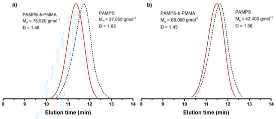 GPC elugram of PAMPS-b-PMMA copolymers with (a) 12% mol and (b) 25% mol of AMPS.