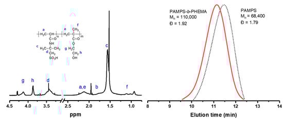 Figure 6 shows the 1H-NMR spectrum and the GPC curves of the copolymer synthesized with a molar composition percentage of 65/35 (% mol, PAMPS/PHEMA). The 1H-NMR analysis confirmed the chemical structure of the copolymer and the characteristic signals of the two PAMPS and PHEMA blocks were identified, matching those reported in the literature [,]. The molar composition of the copolymers was calculated by integration of the peaks at 3.43 and 3.86 ppm associated with the methylene protons adjacent to the –SO3H group of PAMPS and the –OH group of PHEMA, respectively. The GPC analysis also confirmed the diblock structure of the PAMPS-b-PHEMA copolymer. The molecular weight of the copolymer increased when compared to the PAMPS macroinitiator and the GPC curve of the copolymer was broader (Ð = 1.92), this was due the percentage of dead chains in the PAMPS macroinitiator as result of high molecular weight and high percentage conversion of the first block [].