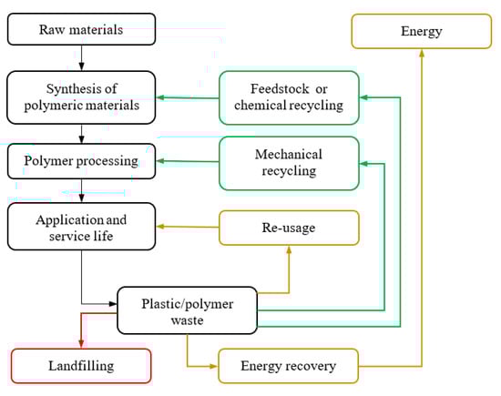 Representation of plastic/polymer waste management based on the work of Vilaplana and Karlsson [3]. Colors are guide of the eye regarding the desired implementation; red: undesired; brown: to be minimized; green: preferred.
