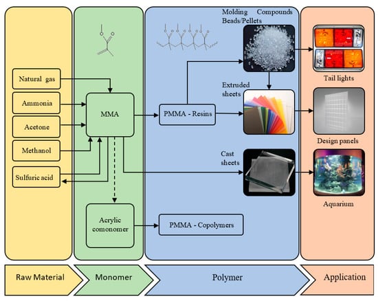 Overview of the synthesis of poly(methyl acrylate) (PMMA); starting from raw material and its applications based on the work of the Methacrylate Sector Group [40].