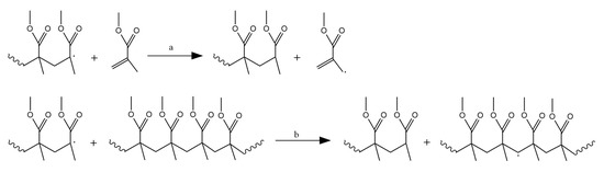 However, Manring indicated a different role of the vinyl-terminated PMMA [30]. A radical in the reaction mixture adds to the double bond of the unsaturated unit of PMMA, as shown in Figure 10b (first step), leading to the formation of a tertiary macroradical, which is prone to depropagation (second step in the same subplot).